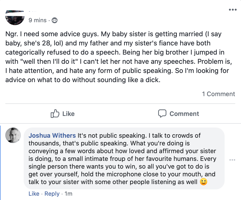 I started “drawing in white” aka erasing, the profile photo and name away but then realised I could just crop it out in Preview on my Mac. So I’ve now anonymised the post, it’s not incriminating or identifiable as the original poster (OP) and my comment is also easily understood in context to the original post.