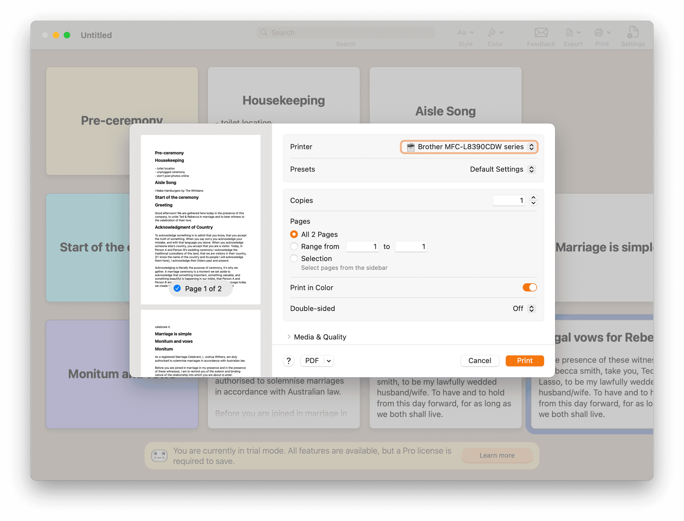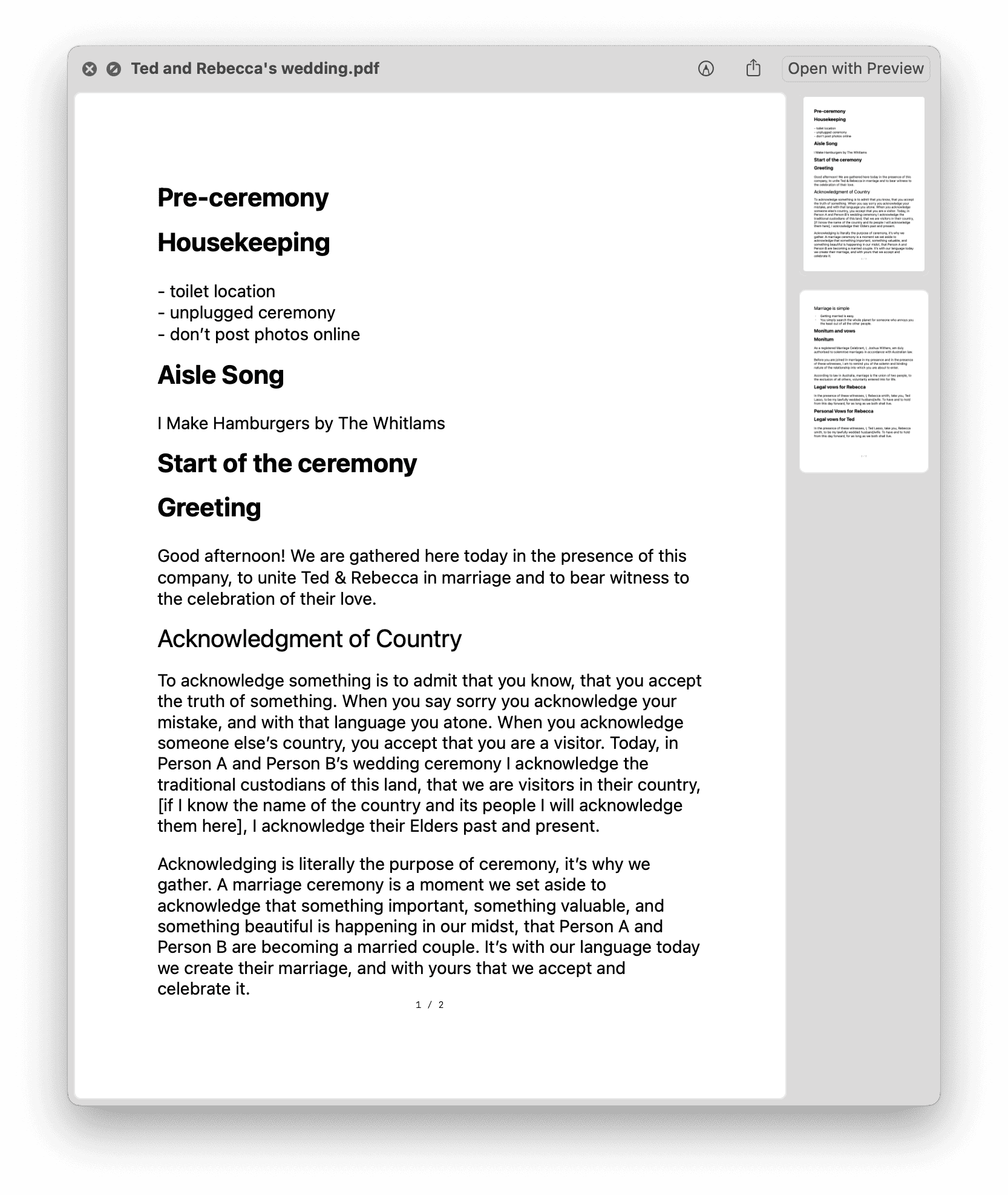 How I imagine using it is to write all my bits in a master file, then duplicate that for someone’s wedding and to rearrange, and edit, as needed. Then you can print out a PDF that would be a great place to read from.