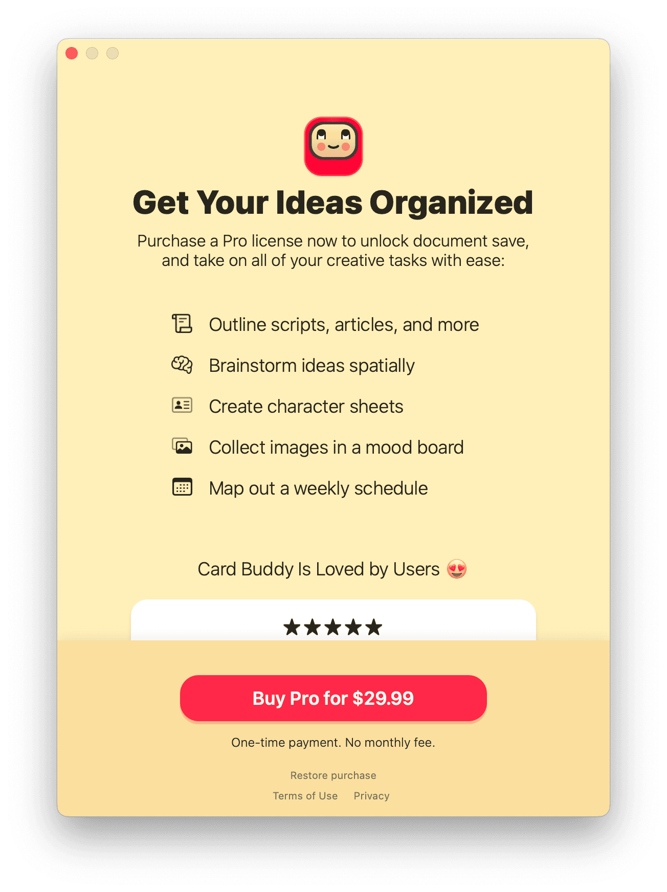 Card Buddy is available in Apple’s Mac App Store for download for free to try, but to save your writing you need to purchase the app. To unlock the app to Pro mode it costs $29.99 - a one off purchase cost.