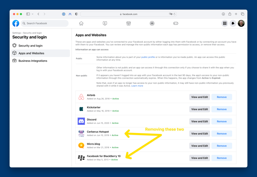 - Finally, if it's a service that other services connect to, like Facebook, I check which apps and websites are authorised to access my account and I remove or delete any I don't use or need any more, and especially any I don't recognise.