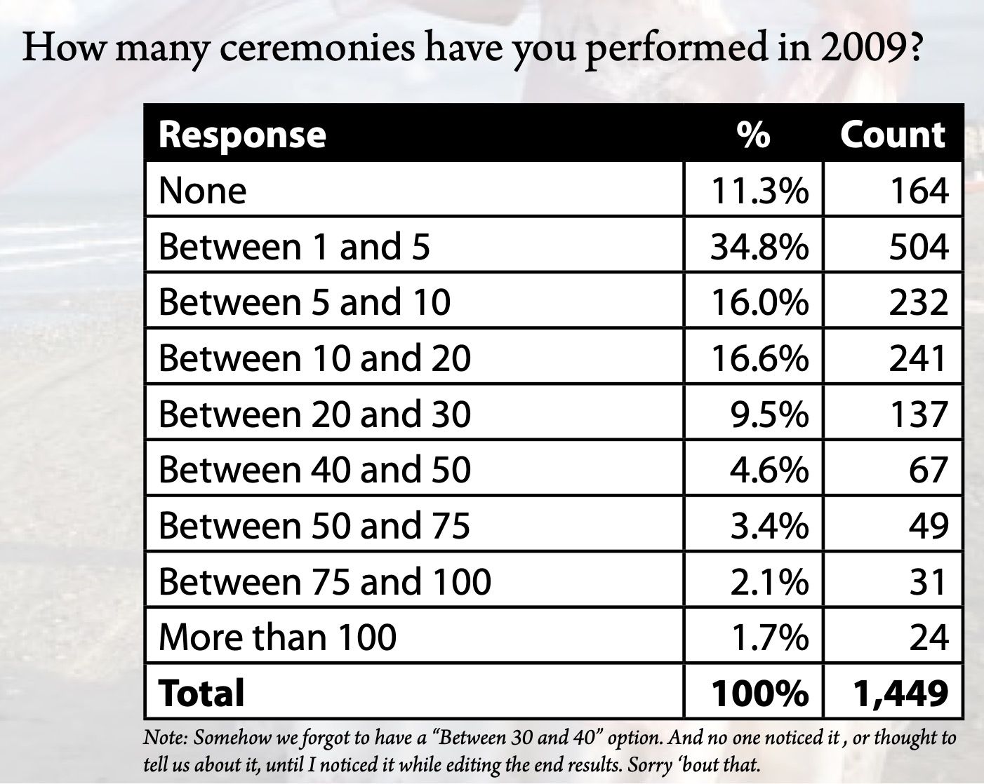 78% of the respondents were conducting less than 20 ceremonies a year.