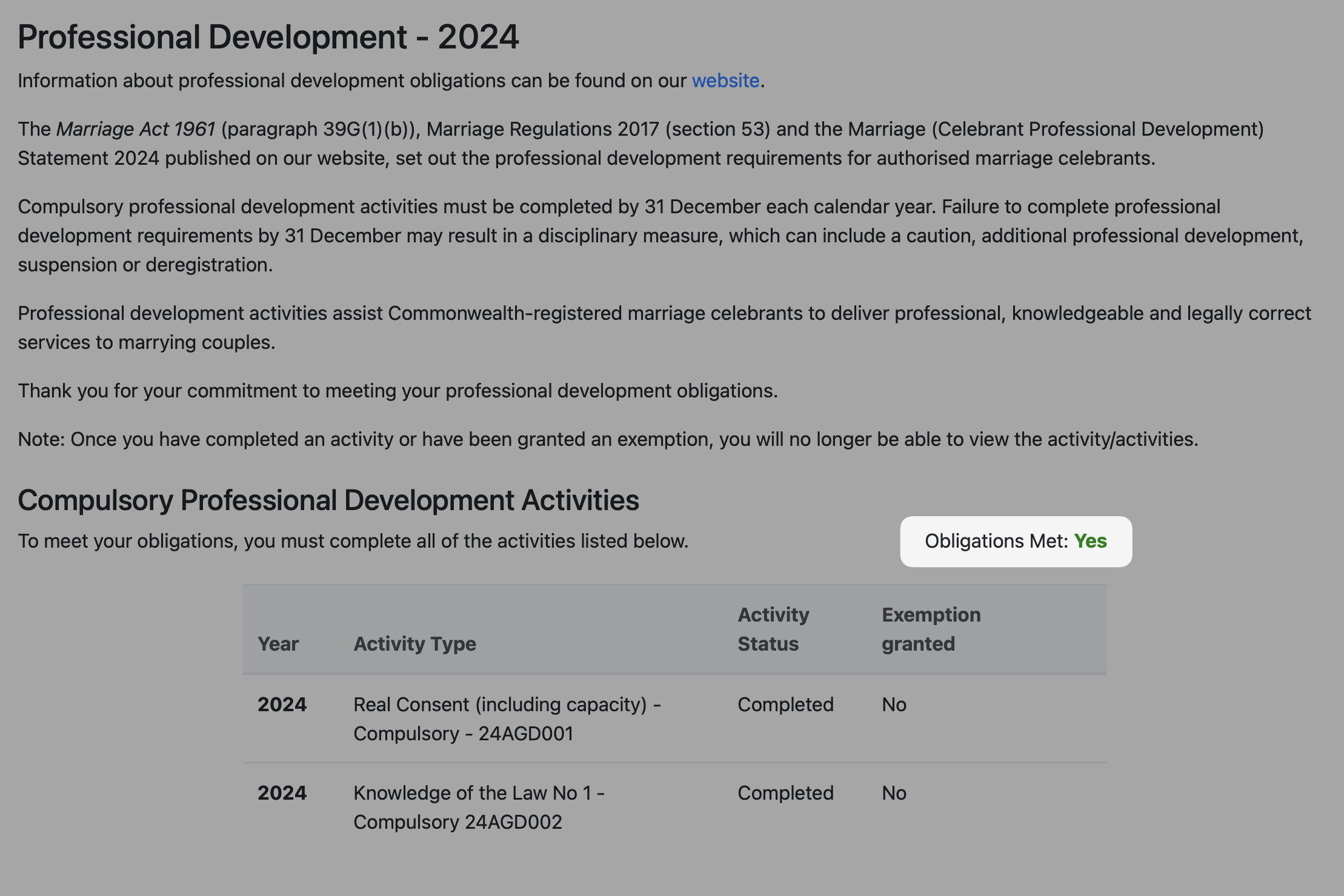 Under s39G(1)(b) of the Marriage Act 1961 it is a legal obligation for registered marriage celebrants to undertake all professional development activities required by the Registrar of Marriage Celebrants. Failure to do so (subject to any exemption granted) may result in disciplinary measures being taken, which may include a caution, additional professional development activities, suspension or deregistration.