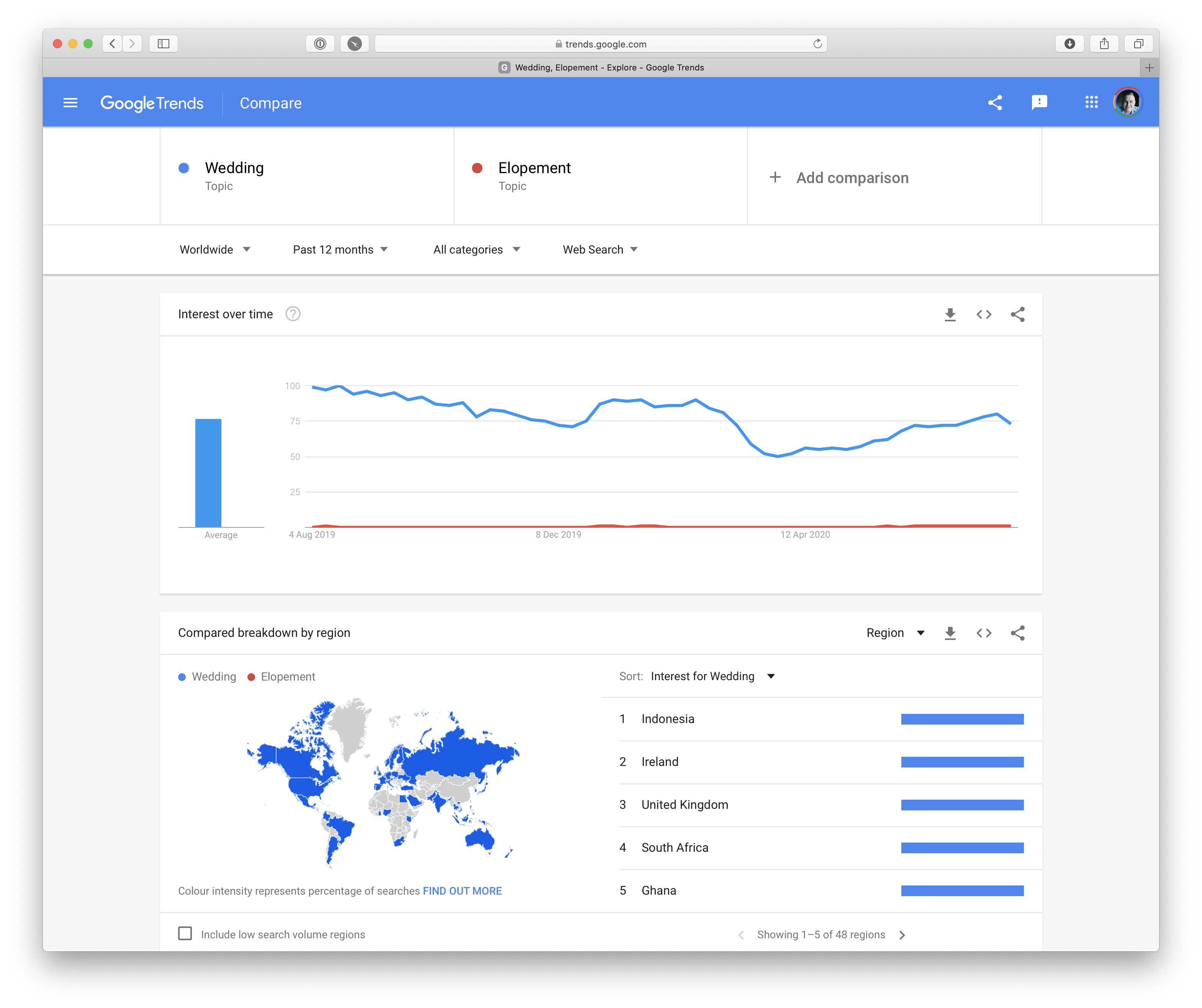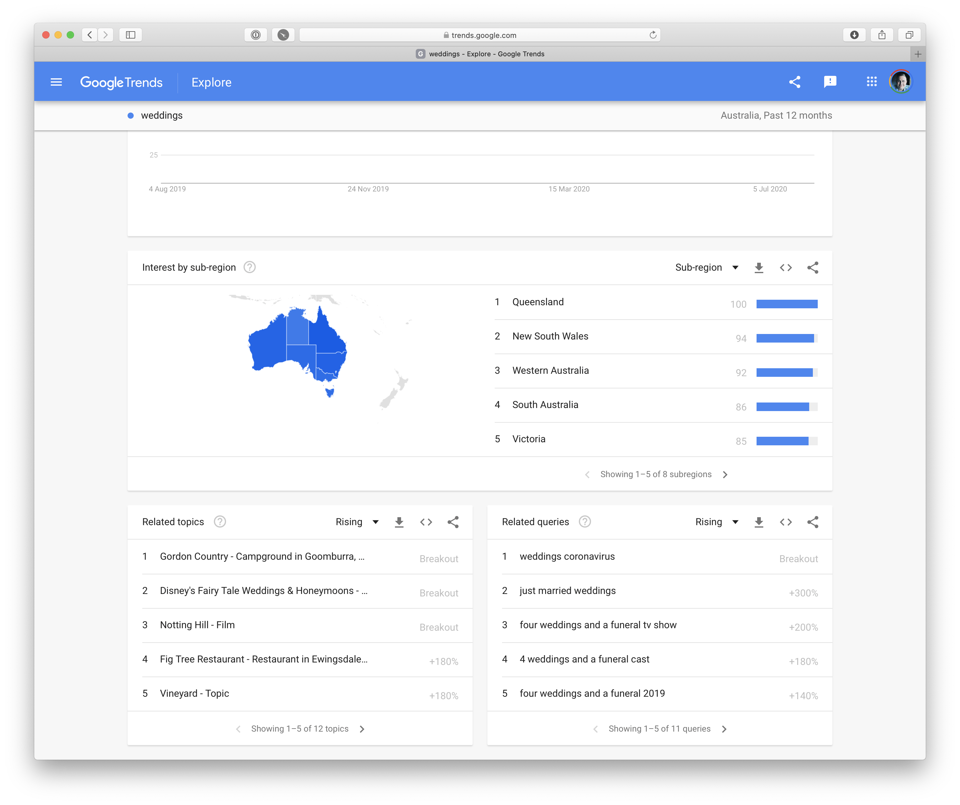 In Google Trends I can understand how real people are searching on the internet for things my business is interested in, weddings for example.