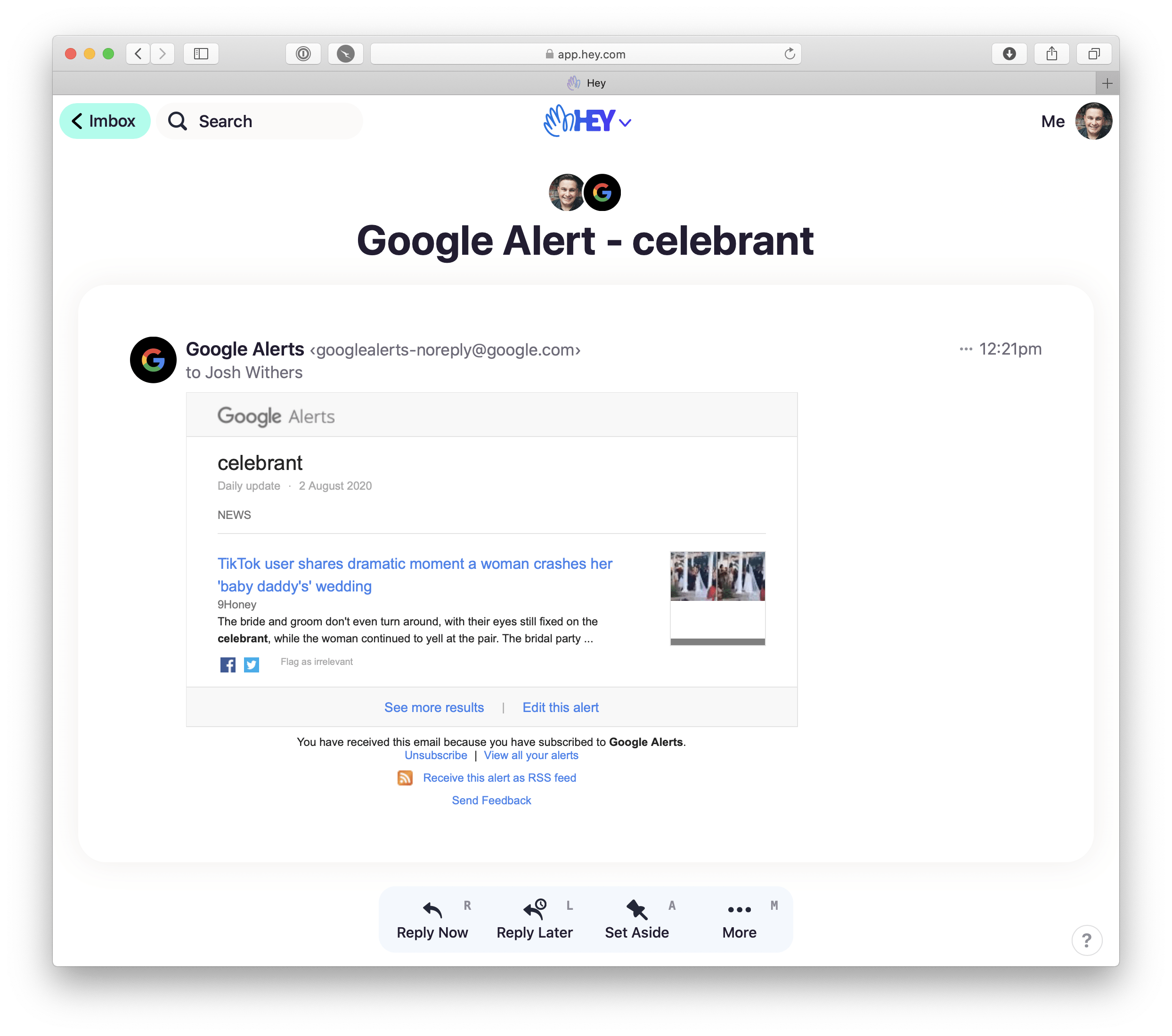 On Google Alerts I have a few select keywords and brand namers that Google alerts me of (emails me) when people and news organisations write about them. This way I can be the first to know when someone is blogging a wedding of mine, or writing about topics I’m interested in.
