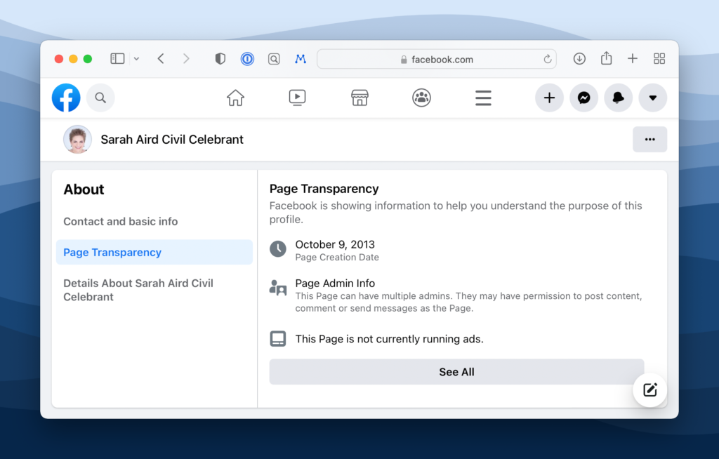 Navigate to your someone’s Facebook page and go to the About section. Scroll down until you see a “Page Transparency” section within the left-side column.