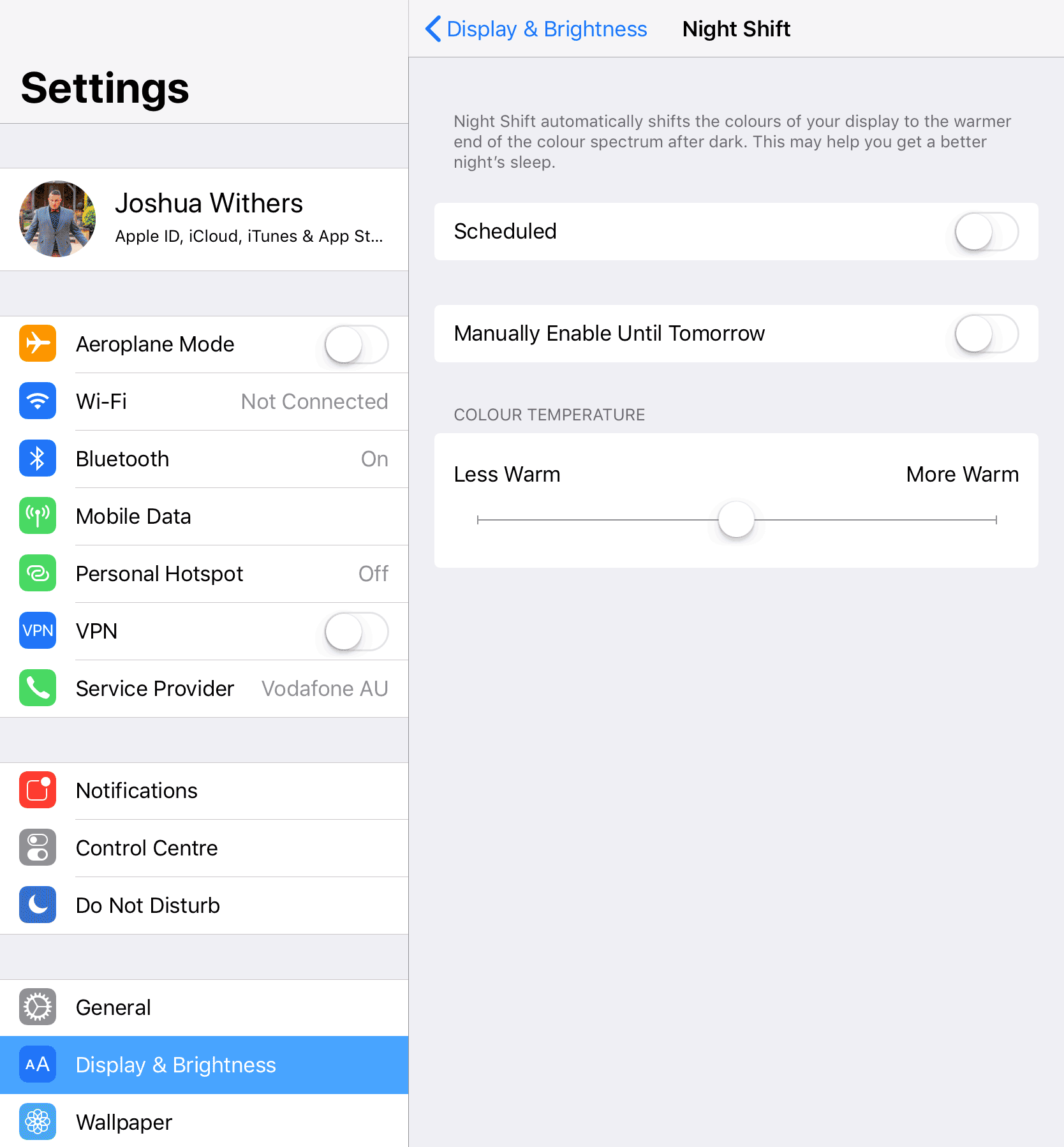 You’ll find it in the Settings app, then “Display and Brightness” and manually enable it until tomorrow.